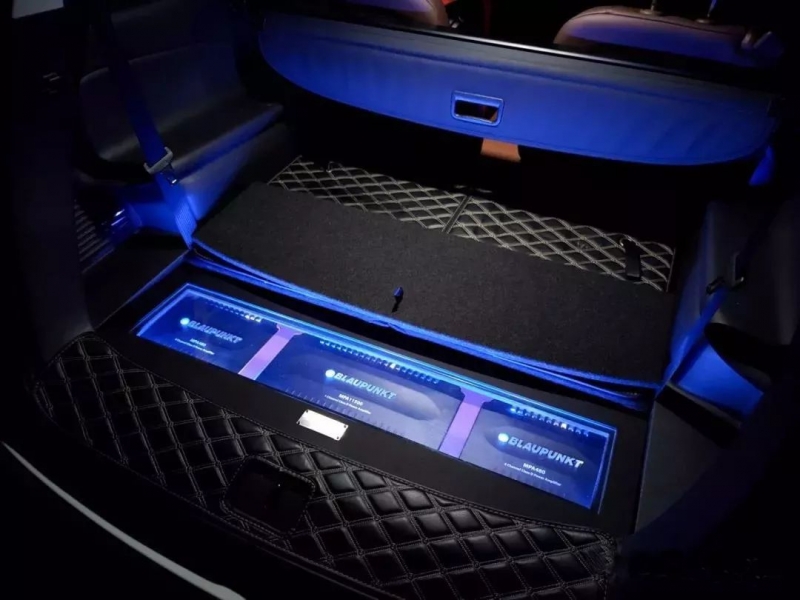 這次改裝配備了三臺(tái)功放,分別是兩臺(tái)德國(guó)藍(lán)寶四路功放和一臺(tái)德國(guó)藍(lán)寶單路功放,造型都比較小巧,尾箱的空間剛好可以放下三臺(tái)功放。為它們做了一個(gè)簡(jiǎn)單的造型,并添加了LED燈光。